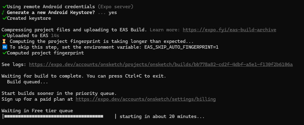 遇到这个问题,我们不必等着,关闭终端窗口并不会终止 build,仅仅是断开了你本地终端与 Expo 云端服务器的日志连接,云端的构建任务(包括排队状态)依然会在 Expo 的服务器上继续进行。